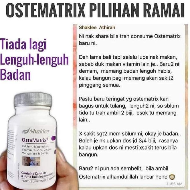 Zinc penting untuk sintesis DNA pembahagian sel pembentukan kolagen sintesis protein dan fungsi imun semua proses yang perlu untuk pertumbuhan semula tisu dan. Bagi saya Ostematrix ni bukan sahaja pil kalsium terbaik untuk memelihara kesihatan tulang tetapi juga banyak. Ostematrix adalah suplemen kalsium dari Shaklee yang bertindak untuk menguatkan tulang membantu fungsi saraf dan mnghindarkan kekejangan otot-otot akibat kemalangan itu.